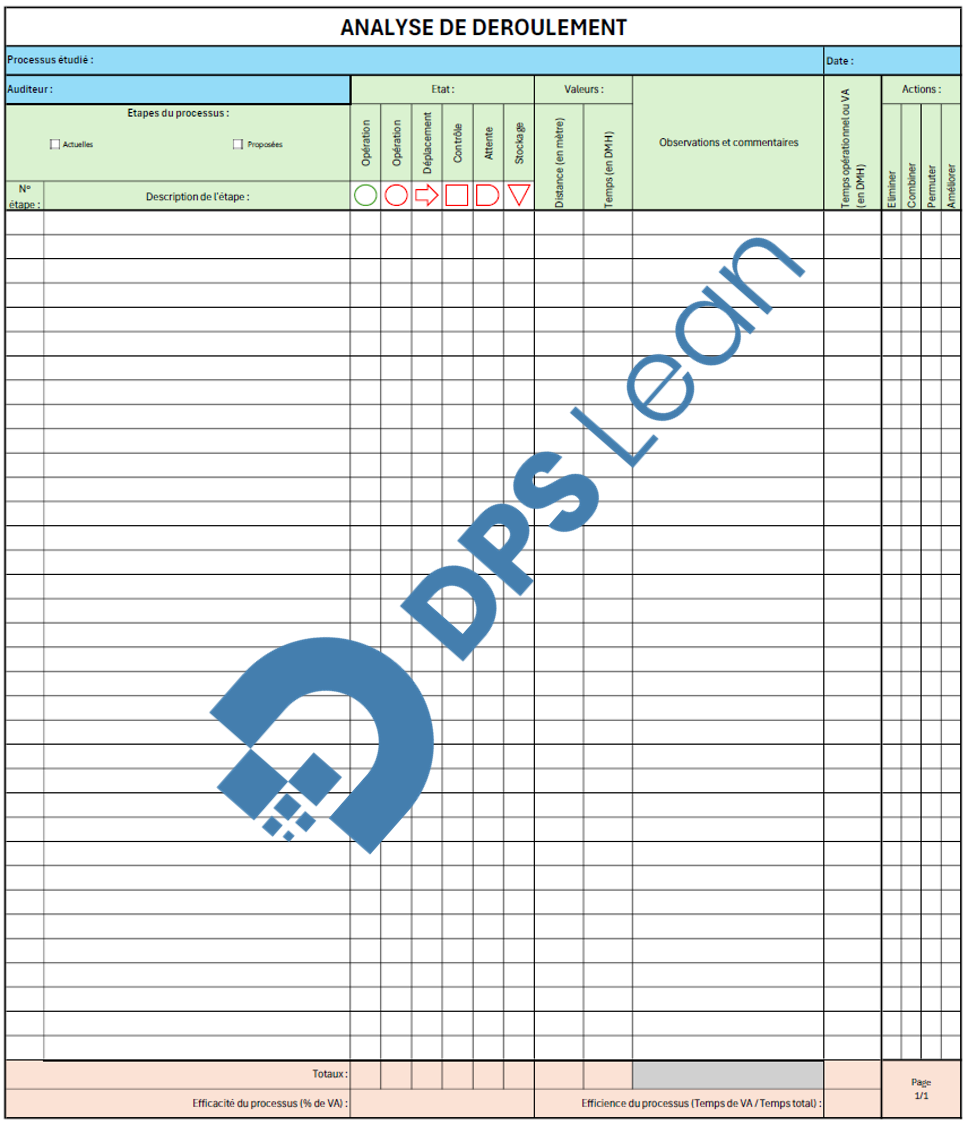 Ce template d’analyse de déroulement est conçu pour être utilisé directement sur le terrain lors de vos observations de processus. Il vous permet de :